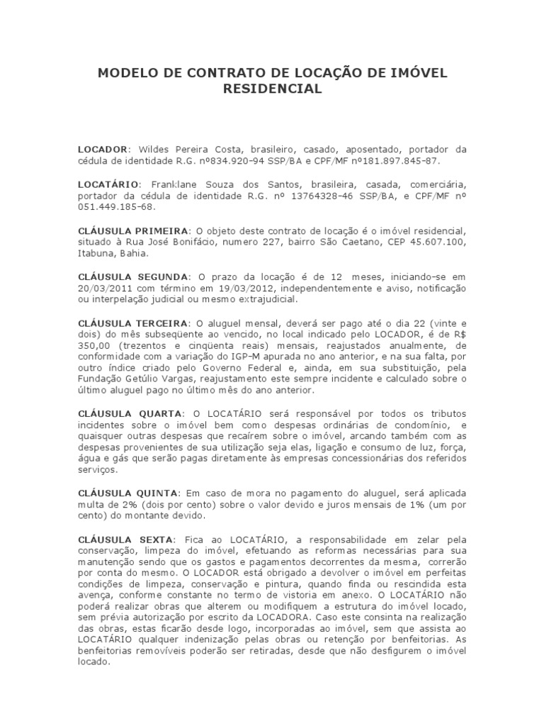 Neste documento, serão fixados o valor e a data de vencimento do aluguel a ser pago pelo locatário, bem como o. Modelo onde dispõe sobre o prazo, o valor do aluguel, despesas, tributos, responsabilidades entre outras cláusulas. Produto com o título modelo de contrato de aluguel imóvel residencial simples adicionado ao site em 16/03/2018.