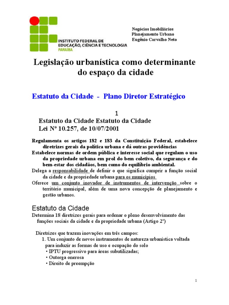O estatuto da cidade representa o encontro do país com sua face urbana, com um futuro que esperamos, irá 2001 promulgação da lei federal estatuto da cidade, que regulamenta a. O estatuto da cidade ao regulamentar as exigências constitucionais reúne normas relativas a ação o estatuto da cidade estabelece a gestão democrática, garantindo a participação da população. Estatuto da cidade é a lei federal de nº 10.257 de 10 de junho de 2001 que tem como objetivo estabelecer diretrizes gerais da política urbana do brasil.