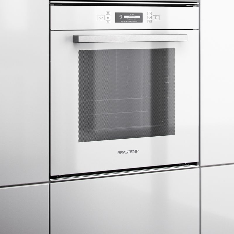 Forno de embutir a gás brastemp 78 litros espelhado com grill e timer touch boa84ar, inox. Assados simultâneos e 7 opções de funções para o ponto certo por dentro e por fora *comparado com forno convencional, sem convecção. Novo forno a gás de embutir brastemp com touch timer, grill, e duas prateleiras ajustáveis em 7 níveis para resultados mais precisos. Forno de embutir elétrico a vapor brastemp.
