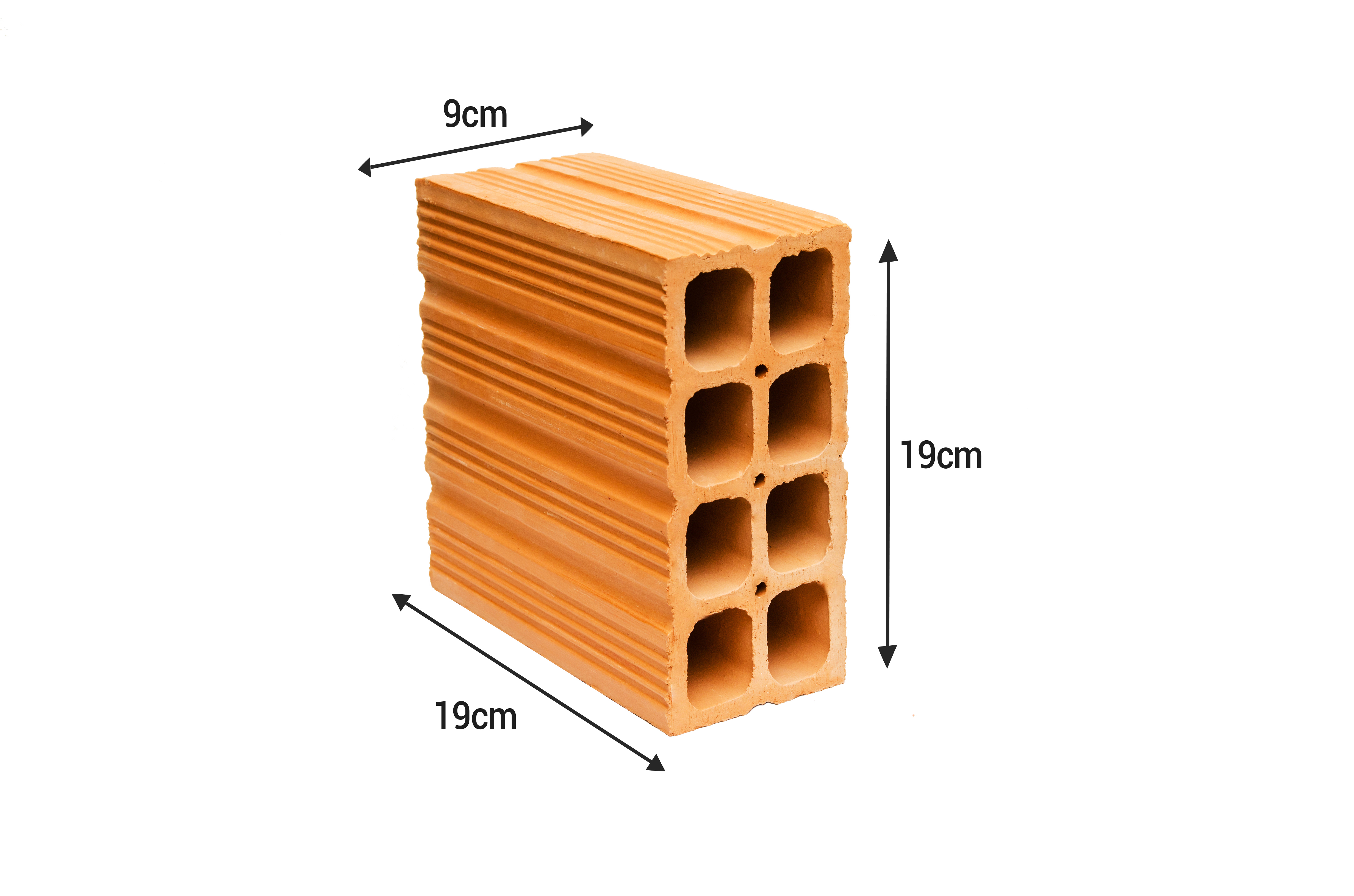 Tijolo 6 furos com furo redondo, medindo 9cm x 14cm x 19cm.