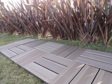 Outro modelo de deck de madeira é o deck de madeira modular isabela envernizado 50cm x 50cm (placa) madeira de lei mista.